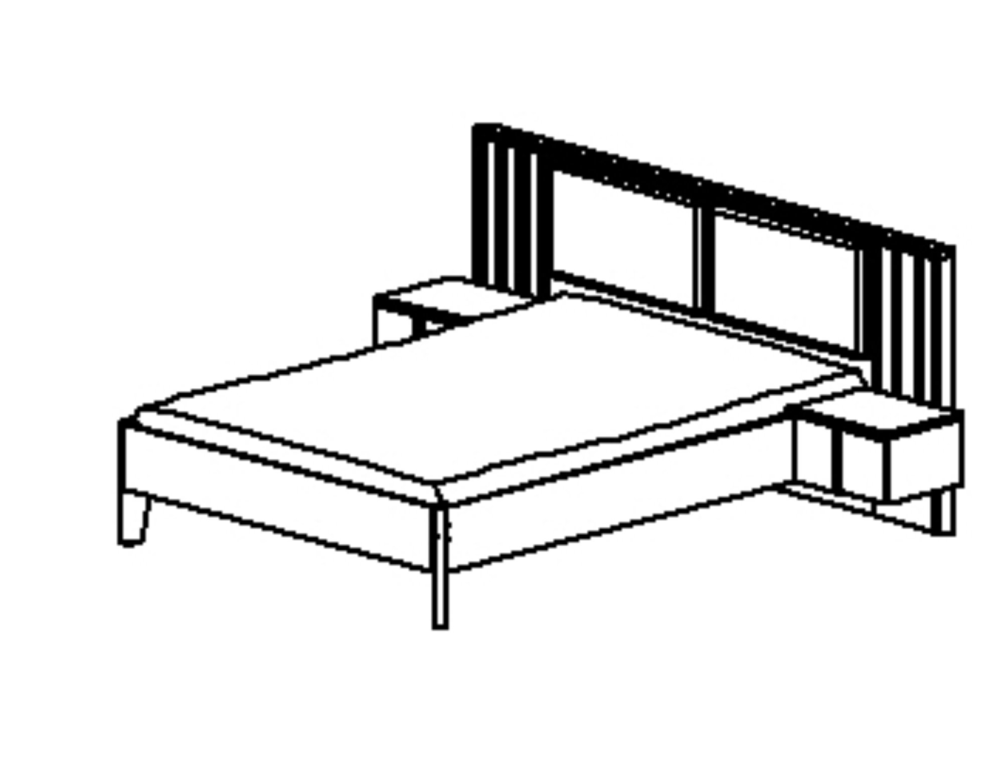 Alles-in-één bed, inclusief een groot hoofdeinde in hotelstijl, met 2 in stof beklede panelen, 2 nachtkastjes met lade, en een LED-verlichtingskit met aan/uit-knoppen bovenop de nachtkastjes.