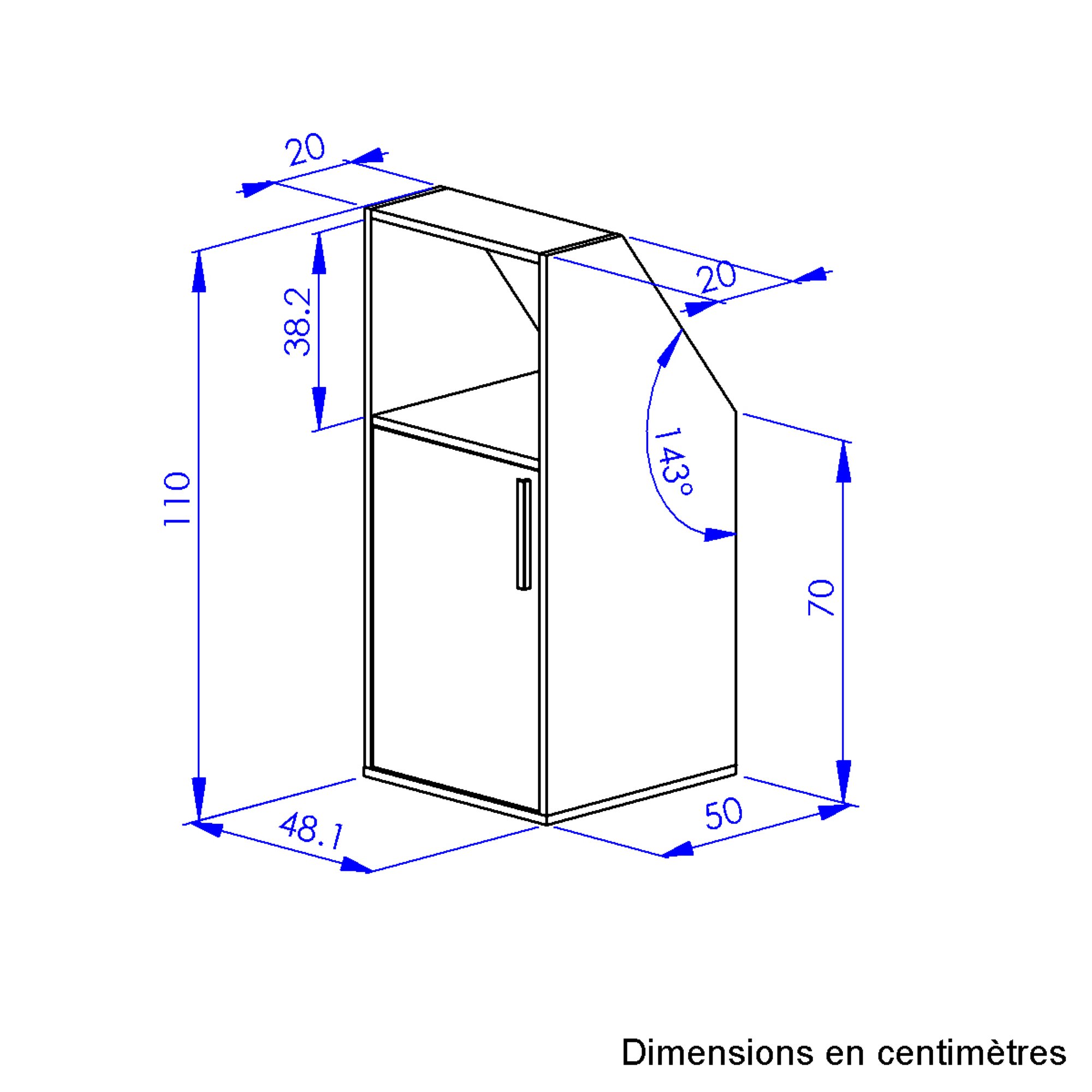 Meubel ontworpen om opbergruimte te creëren onder een schuine wand. De zijkanten zijn schuin afgesneden en de bovenkant is minder diep dan de onderkant.